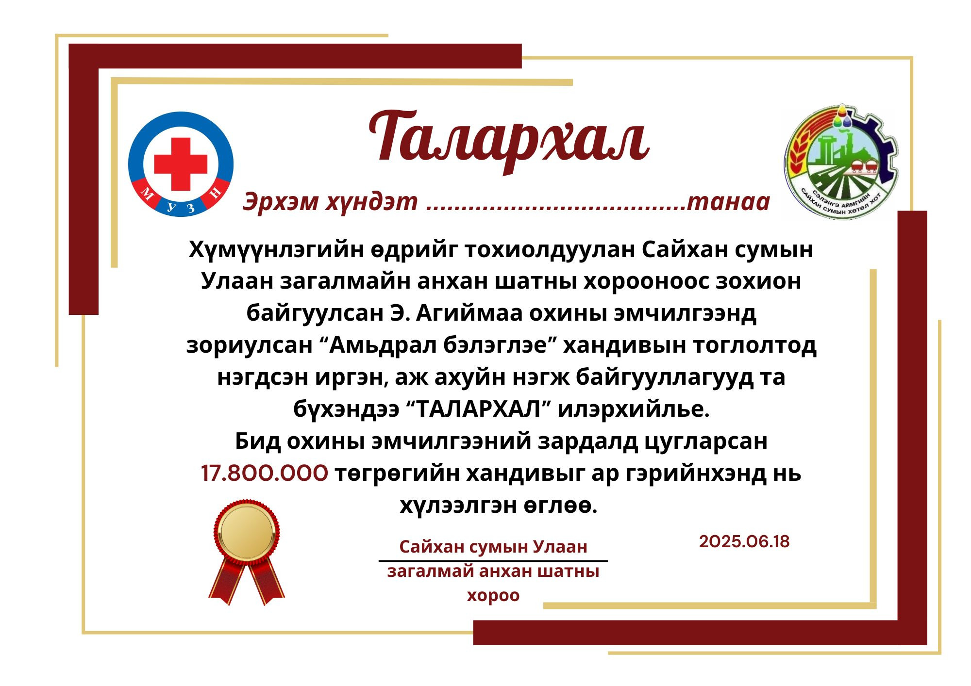 МУСТА гэр бүлийн дуучид П. Гэрэлт-Од, Б. Гантуяа нар оролцсон бөгөөд эмчилгээний зардалд бид 17.800.000 төгрөгийг цуглуулан ар гэрийнхэнд нь хүлээлгэн өглөө.